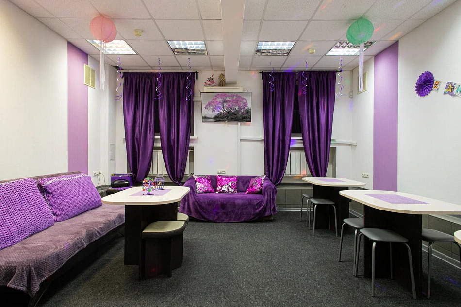 В комнате есть удобные столики, мягкие диваны для отдыха, прекрасное световое оборудование, имеются одноразовые тарелки, столовые принадлежности, скатерти, керамические кружки, настольные игры. Музыкальное сопровождение мероприятий обеспечивает современный проигрыватель.