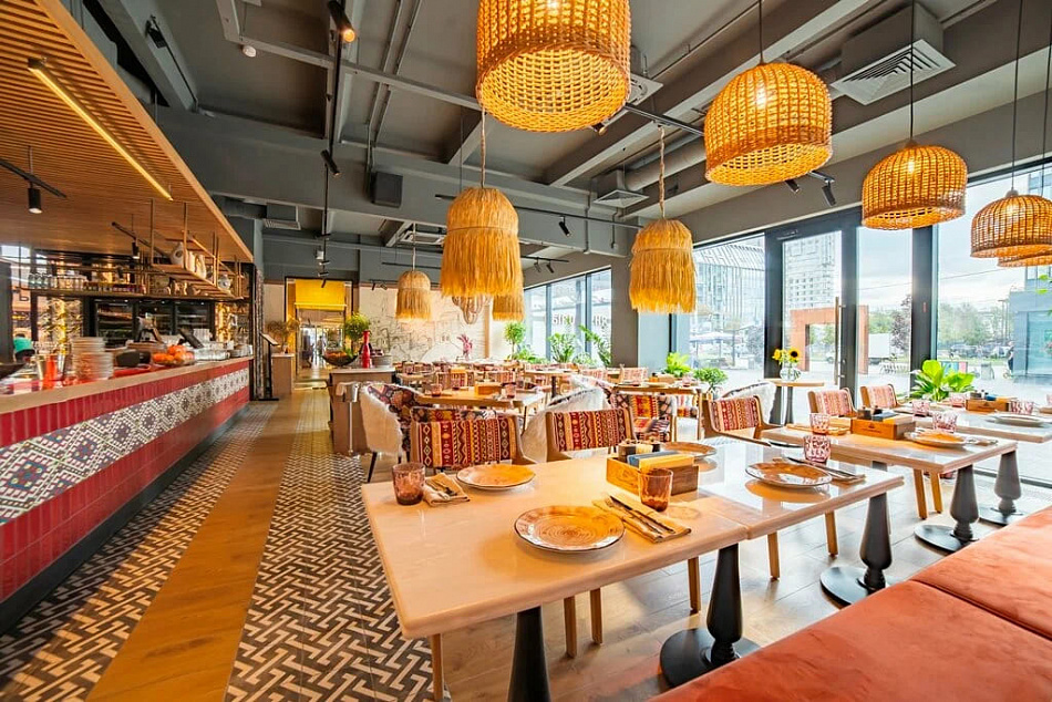 В отделке и элементах обстановки использовано натуральное дерево, подчёркивающее уютную атмосферу, плетёные изделия. Здесь много красивых гончарных изделий с живыми растениями, а оригинальные светильники на потолке своей необычной формой напоминают традиционные папахи. Яркими акцентами заведения являются национальные узоры, украшающие стулья, и мягкий белый «каракуль», использованный в отделке кресел.